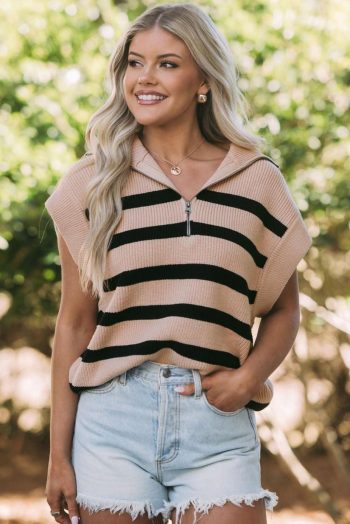Knit Tops | Khaki Stripe Zipped Collar Short Sleeve Knitted Top – Women