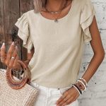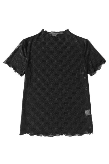 - Effortlessly Chic, This Mesh Top Combines A Mock Neck Design With Delicate Lettuce Trim Short Sleeves For A Sophisticated Look With A Touch Of Playfulness.