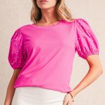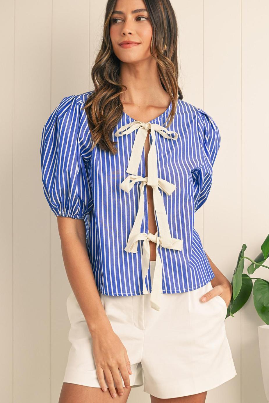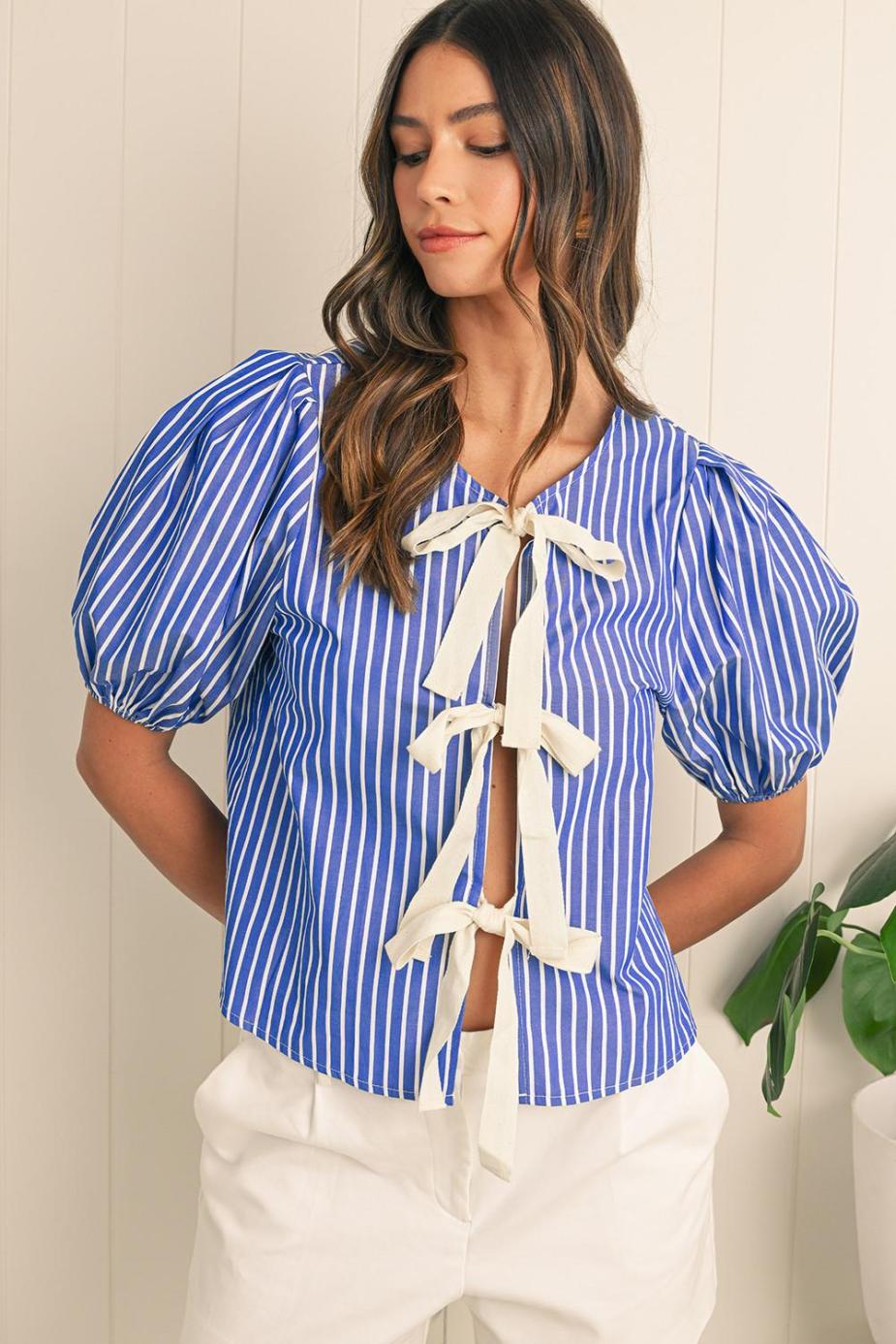 - The Short Puff Sleeves And Bow Tie Front Detail Add A Playful And Feminine Touch.
