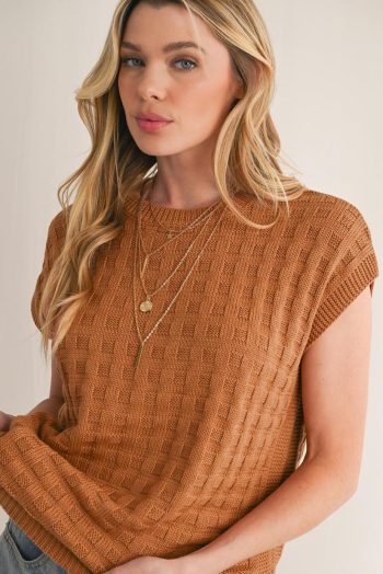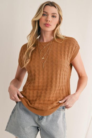 • Crafted In A Versatile Camel Color, This Features A Subtle Checkered Texture That Adds Depth And Visual Interest To The Plain Rib-Knit Fabric.