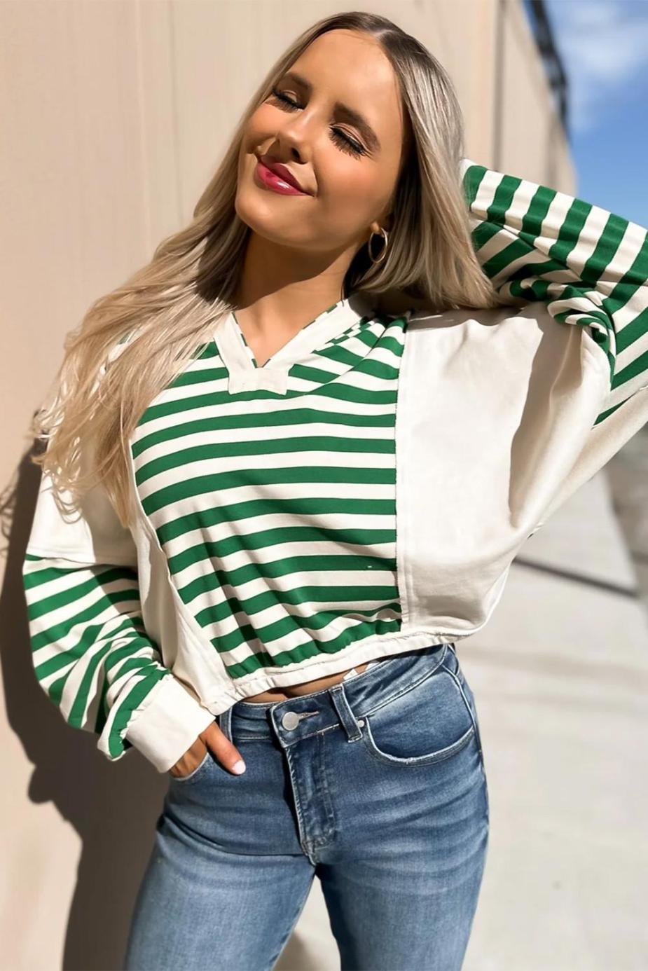 Long Sleeve Tops | Green Striped Colorblock Patchwork Collared V Neck Cropped Pullover – Women