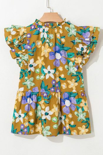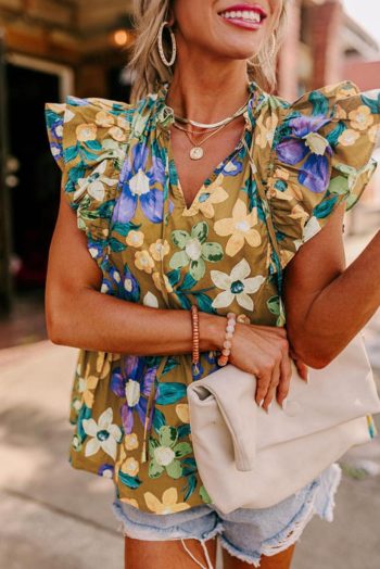 - Embrace Sunny Days With Our Ruffle Top, Radiating Bohemian Charm With Its Vibrant Hue And Intricate Floral Pattern.