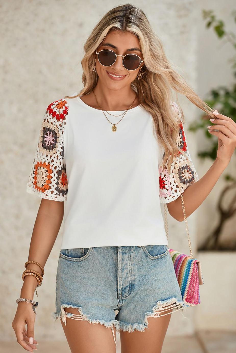 T Shirts | White Floral Hollowed Crochet Sleeve Boho T Shirt – Women