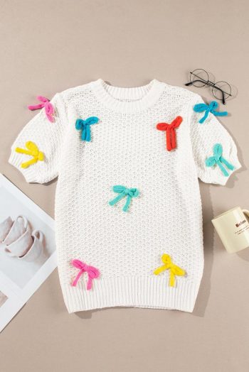 Knit Tops | White Colorful Bow Knit Short Sleeve Sweater – Women