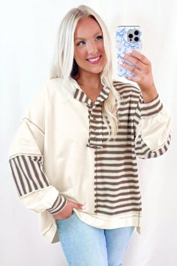 Long Sleeve Tops | Khaki Striped Patchwork Oversized Pullover Top – Women