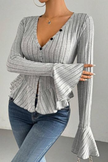 Long Sleeve Tops | Light Grey Slim Fit Ruffle Hem Ribbed Long Sleeve Top – Women