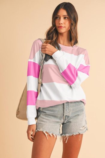 Long Sleeve Tops | Pink Color Block Sleeve Loose Fit Top – Women