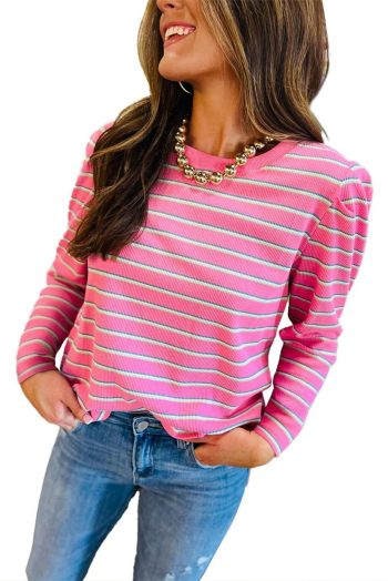Long Sleeve Tops | Rose Striped Textured Knit Puff Sleeve Round Neck Top – Women