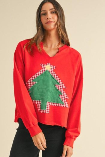 Long Sleeve Tops | Tomato Red Christmas Tree Patched V Neck Long Sleeve Pullover – Women