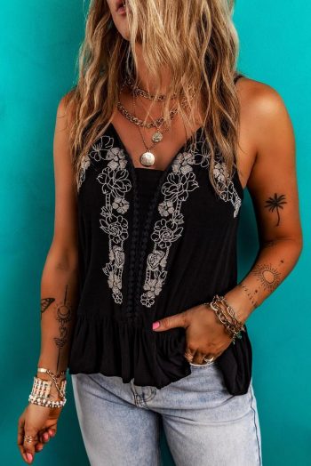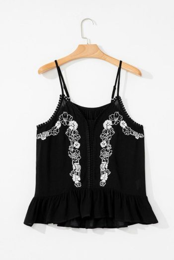Sleeveless Tops | Black Floral Embroidery Ruffled Spaghetti Straps Tank Top – Women