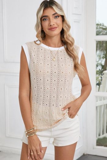 Sleeveless Tops | Oatmeal Floral Textured Crew Neck Sleeveless Top – Women