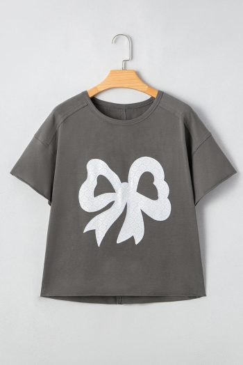 T Shirts | Medium Grey Bow Pattern Raw Edge Drop Shoulder Casual T Shirt – Women