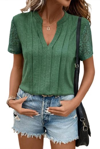 T Shirts | Mist Green Lace Patchwork Sleeve Pleated V Neck T Shirt – Women