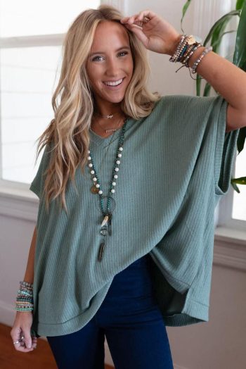 T Shirts | Moonlight Jade Oversized Ribbed Knit V Neck Short Sleeve Top – Women