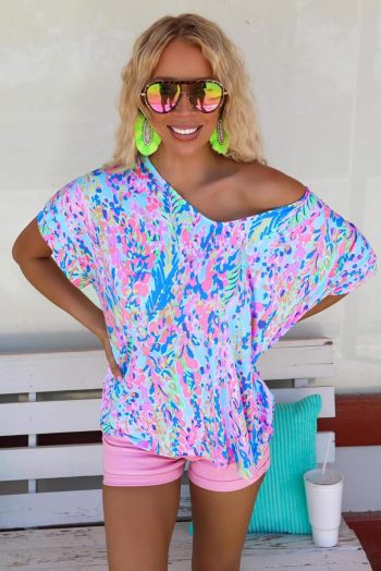 T Shirts | Pastel Blue Abstract Floral Print Short Sleeve V Neck T Shirt – Women